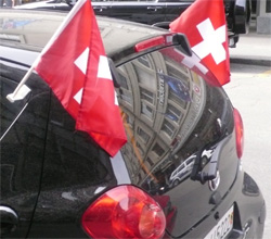 Eine Woche vor Beginn der Euro 2008 wollte ich doch mal gucken, ob die Schweizer schon in Partylaune sind. Und wirklich ... alle fiebern hier dem Beginn der Europameisterschaften entgegen. Die Autos sind jetzt schon beflaggt, wofür die Schweizer gleich 2 Paragrafen ihrer Strassenverkehrordnung nach langen Diskussionen ändern mussten :-) Diskutiert wird in den Zeitungen über die Flaggen immer noch. Nicht erlaubt ist es nämlich, Flaggen aus dem Auto heraus zu schwenken. Woran man sich aber in der italienischen Schweiz noch nie gehalten hat :-)). Nach meinem Besuch 2007 ( Bericht siehe -->hier ) war ich diesmal ja schon auf die sprachlichen Unterschiede etwas vorbereitet. Wichtig: Salsa-Events heissen 'Anlässe'. Wenn man tanzen geht, heisst es: Man geht in den Usgang. Korrekt hingegen ( im Gegensatz zu Berlin ) benennen die Schweizer die Musikrichtungen in der Salsa. Man sagt hier Salsa Puertoricena oder New York Salsa zur Musik und zu Cross Body Style auf 1 (weil Musik und auch Tanzrichtung dort ihren Ursprung haben).